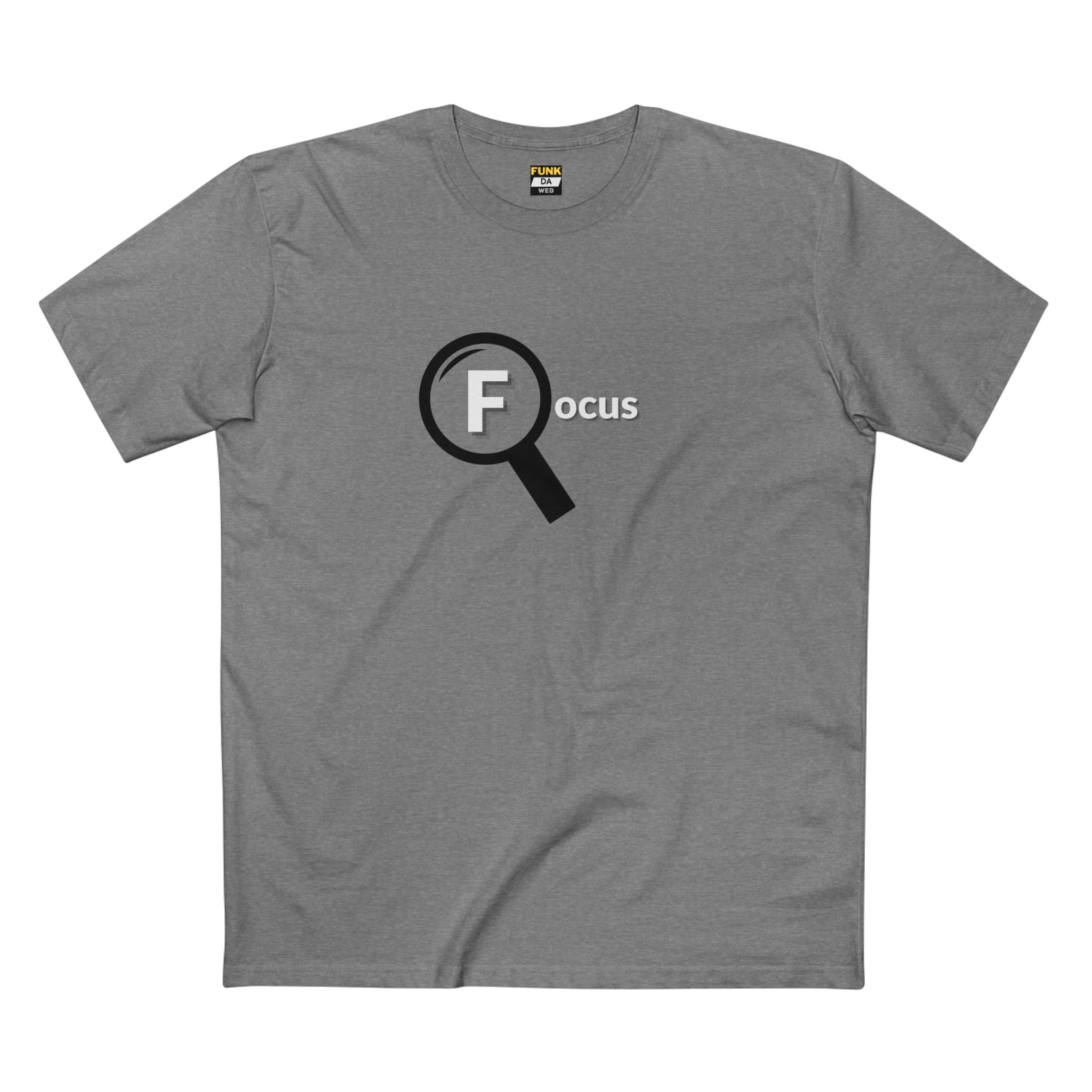What you focus on, you magnify. The "Focus" tee features the letter "F" highlighted under a magnifying glass, symbolizing the power of focus in your life. When you direct your energy towards the right things, everything else fades into the background.